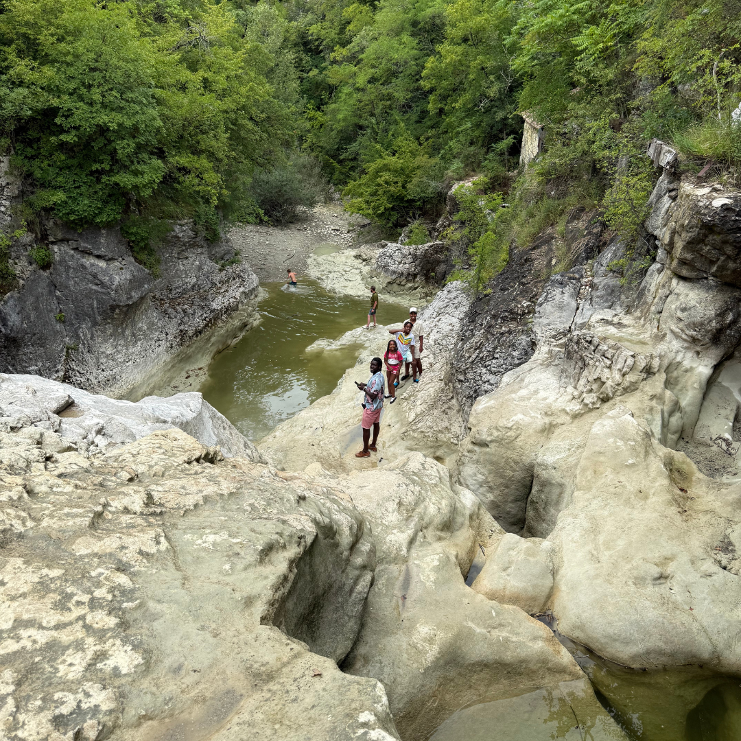 We moesten klimmen en onder hekken door om bij de waterval te komen. We volgde de stroming!