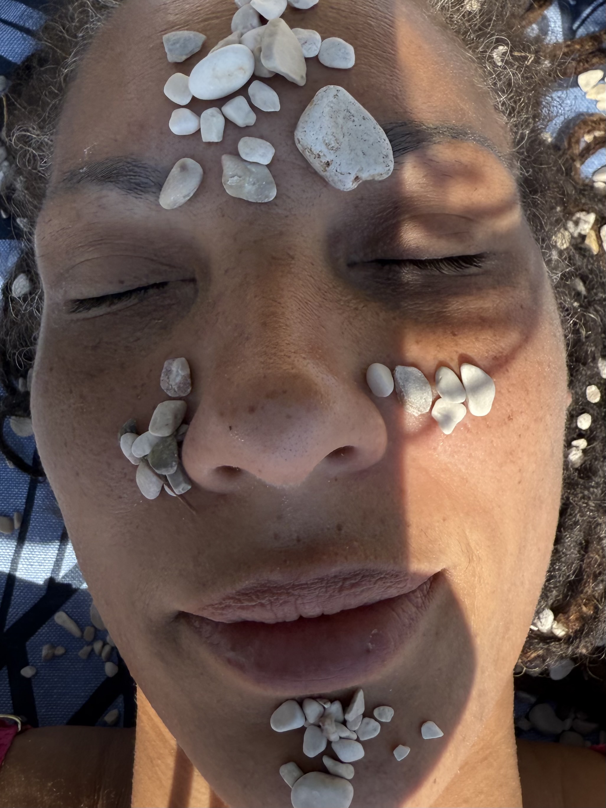 Samen met de kids lag ik op een kleedje op de warme stenen. Toen ik lag te pitten gaven m’n zoon en dochter me een soort hot stone massage waarbij ze kleine steentjes over mn lichaam lieten vallen. Heel ver weg voelde ik dat er iets zachts over me heen viel. Ik was erbij maar toch ook weer niet.