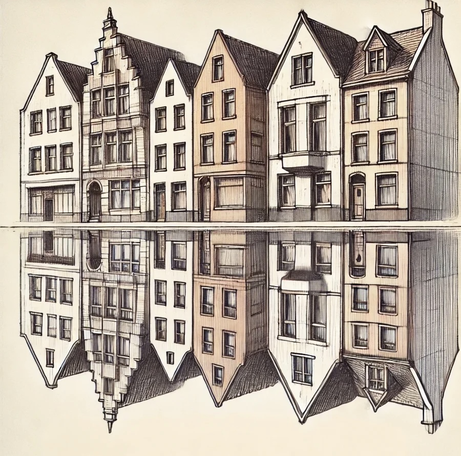 We zagen een afbeelding op de muur: een rij Amsterdamse huizen, gespiegeld. “So above, so below.” Het voelde als een teken dat ik niet dezelfde weg als mijn moeder hoef te volgen. Ik kies een nieuwe weg!