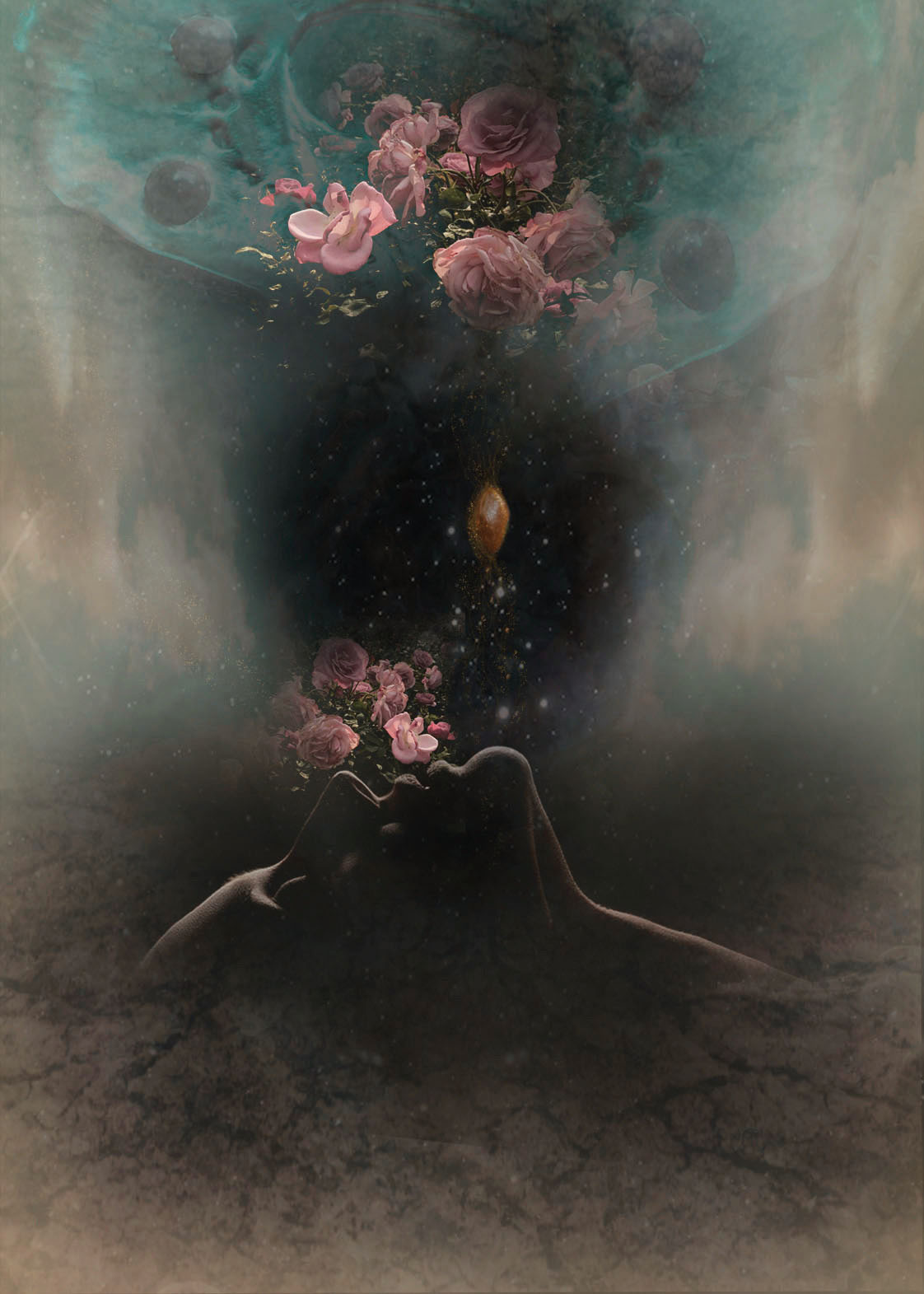 Even voelt het vreemd, bijna eng. Ik voel dat ik om me heen kan kijken maar welke kant ik ook op kijk er is niks…. Ik probeer licht te maken, het bloemenveld te creëren. Ik zie de contouren van een grote bloem… maar alles verdwijnt opnieuw in zwart.