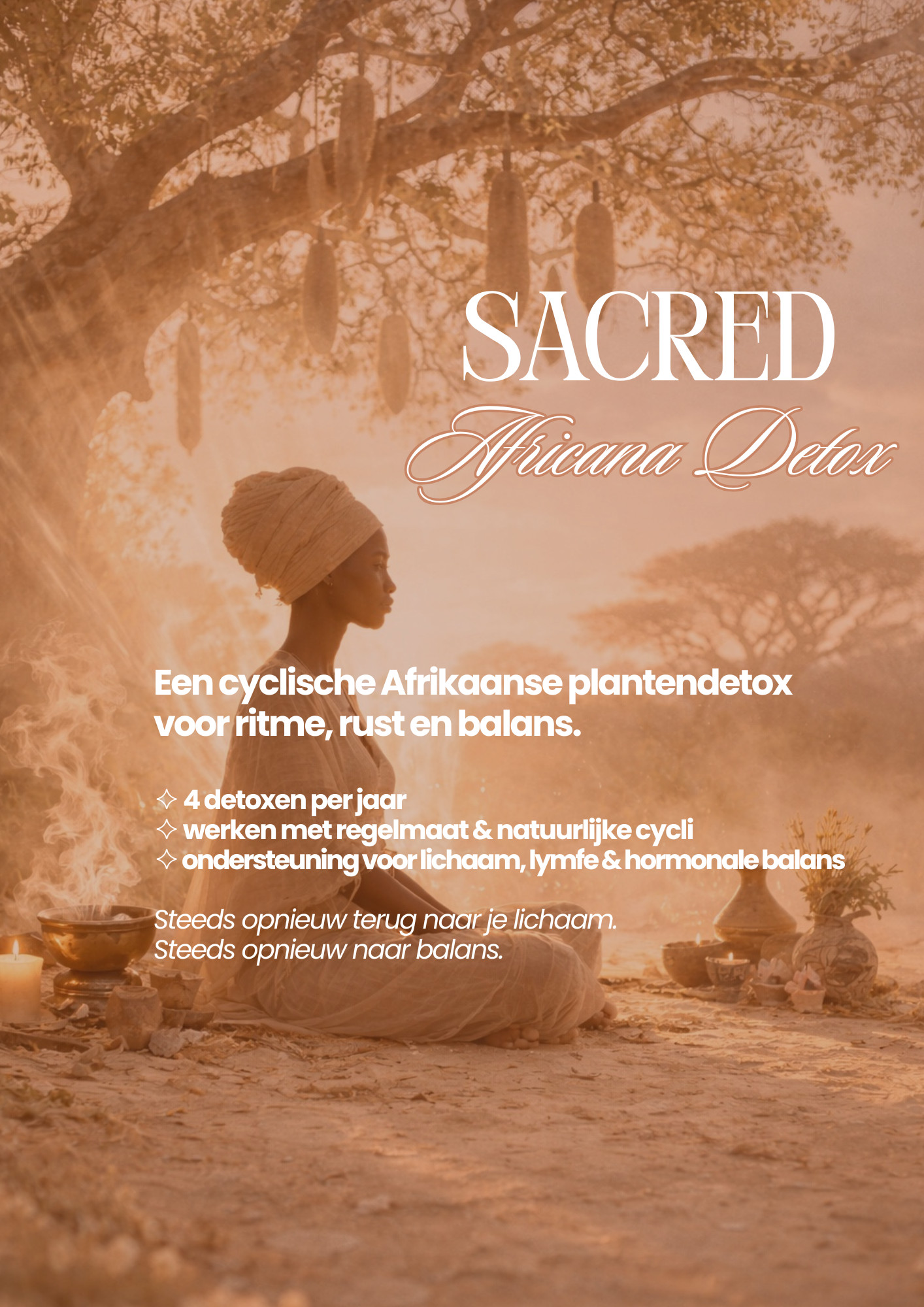 Een jaarbedding voor lichaam, ritme en balans. Sacred Africana is een cyclische detox-reis met Kigelia Africana een oeroud plantmedicijn uit Senegal.